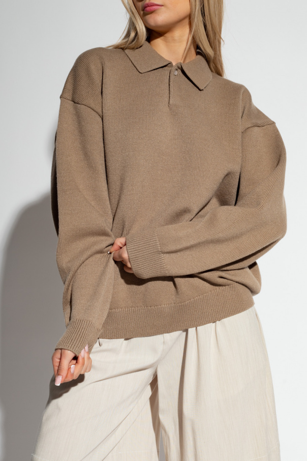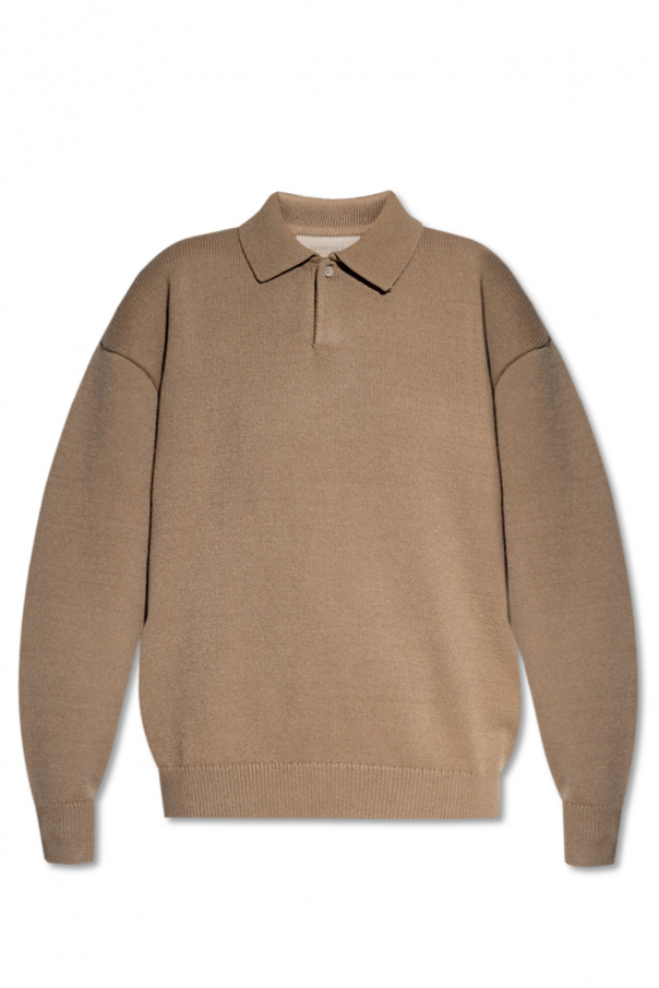 Brown polo sweater from Fear Of God Essentials. Accentuated with a black logo patch at the back, this style features a collar with a button placket, long sleeves and elasticized edges.