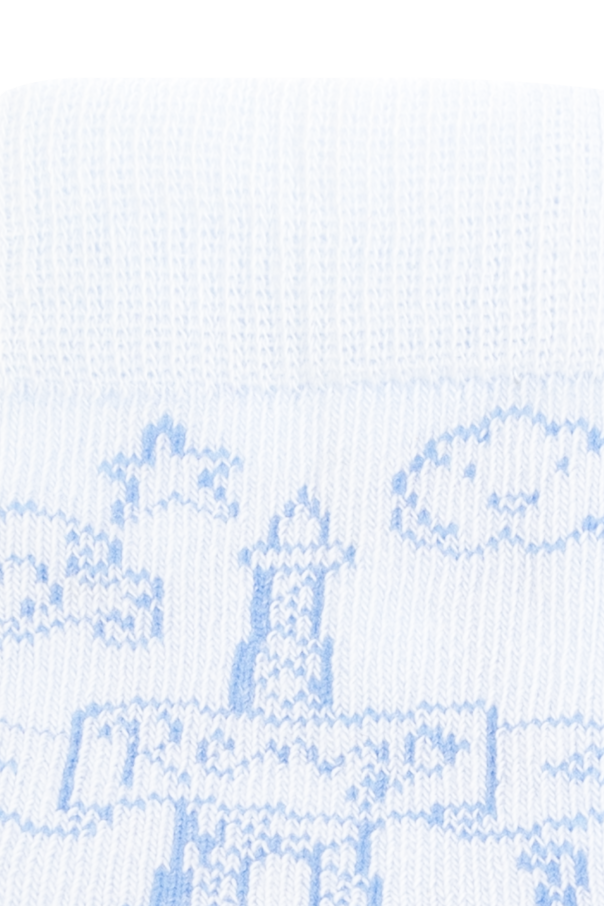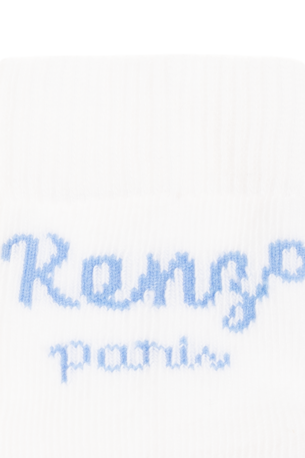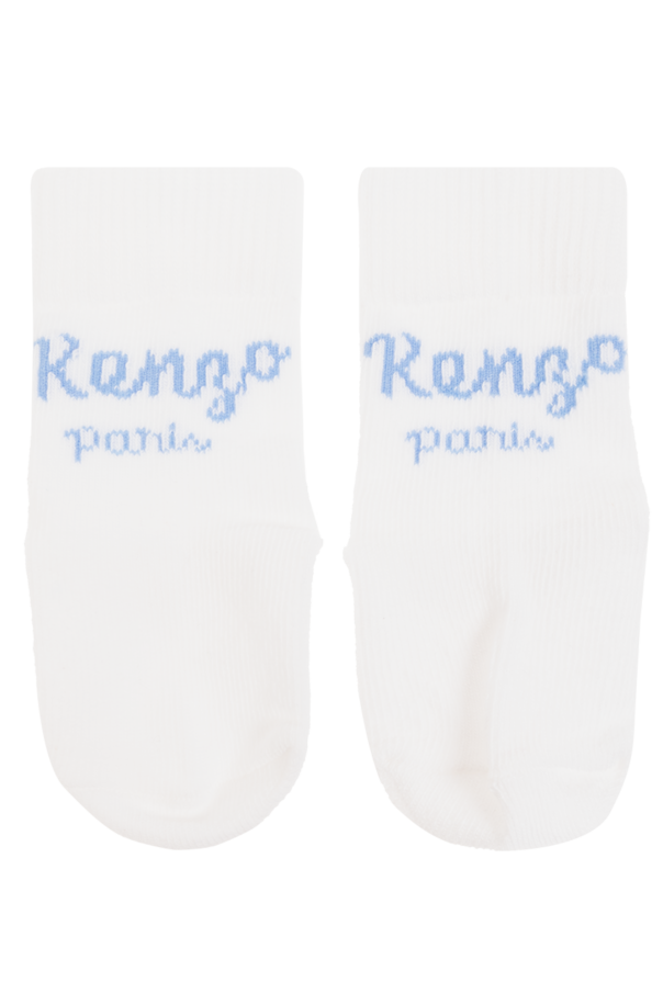 White and blue socks two-pack from Kenzo Kids. Made of cotton, each pair showcases graphic embroidery accompanied by a logo and ribbed cuffs. Box included.