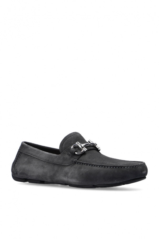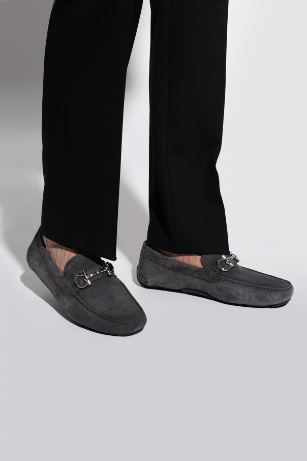 Grey ‘Parigi’ moccasins from Salvatore Ferragamo. Made of suede, this pair sits on a black rubber sole and showcases silver-tone Gancini hardware on the front.