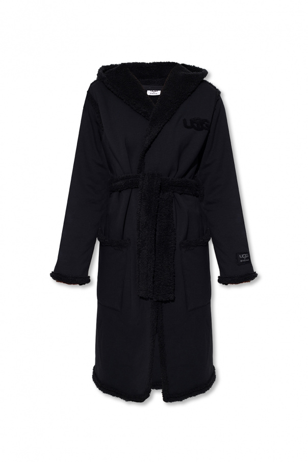 Black hooded bathrobe from UGG X Telfar. Made of cotton, this style features logo detailing, a waist-cinching belt, two frontal pockets and Sherpa trims and lining.