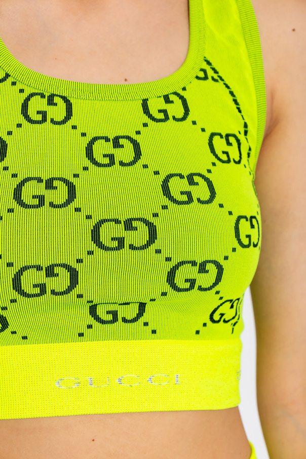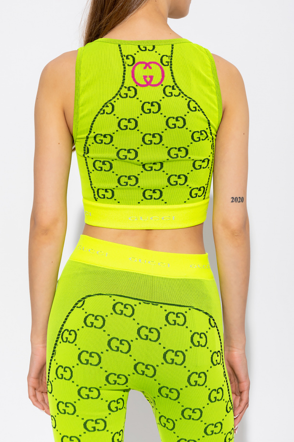 Neon green training crop top from Gucci, the ‘Gucci Love Parade’ collection. This design is enriched by an embroidered GG motif in black, pink logo at the back and ribbed trims.