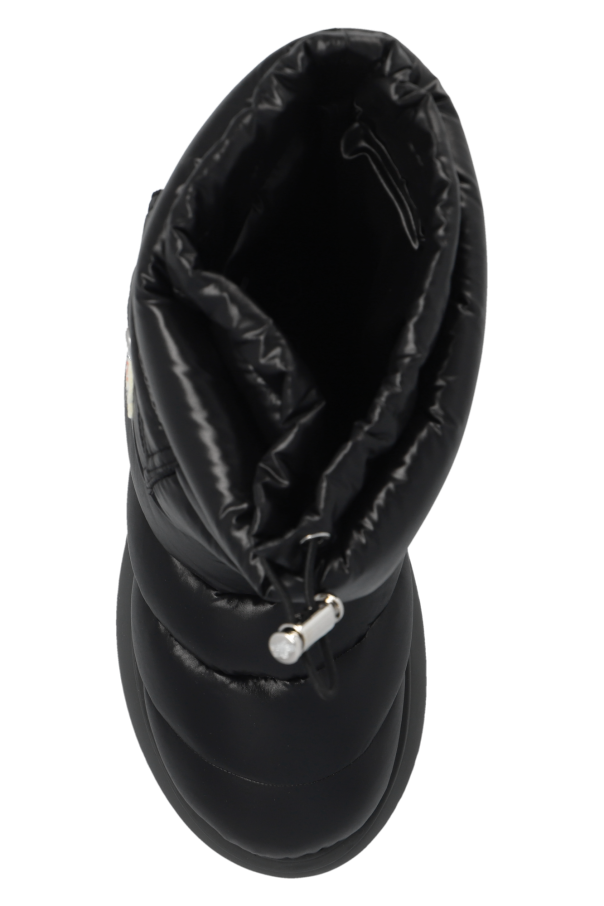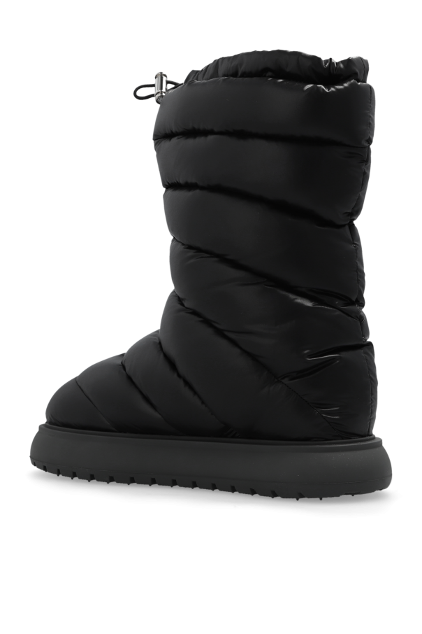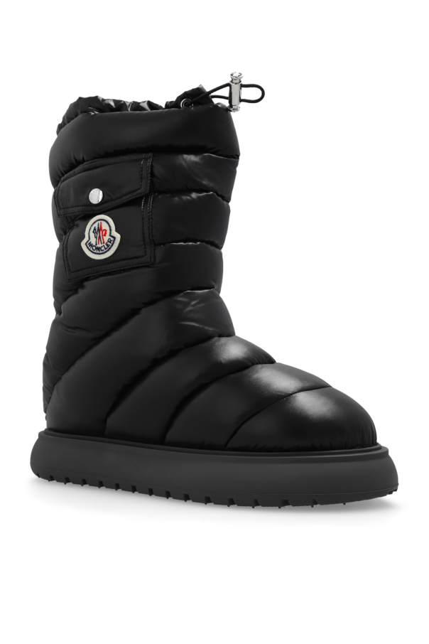 Black ‘Gaia’ quilted snow boots from Moncler. Crafted from waterproof fabric, this pair sits on a black rubber sole and is complete with drawstrings at the cuff as well as a snap-fastened flap pocket and logo patch to the side.