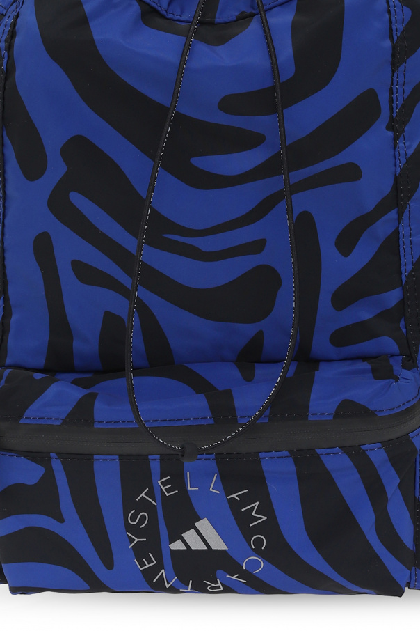 Dark blue and black backpack from ADIDAS by Stella McCartney. Made of recycled materials, this model features a drawstring closure, animal motif, silver-tone reflective logo appliqué, front zip pocket, top handle, adjustable shoulder straps with a white logo embroidery and one internal compartment with one zip pocket.