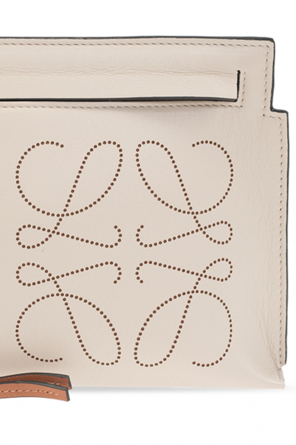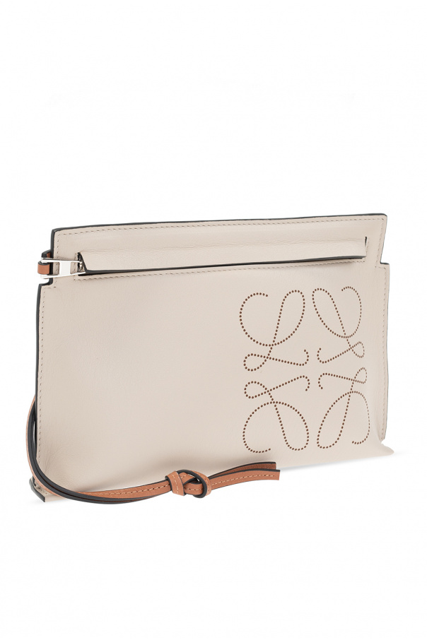 Beige ‘Brand Mini’ clutch from Loewe. Crafted from leather, this design fastens via a zip and showcases a brown Anagram motif, silver-tone metal hardware and one internal compartment.