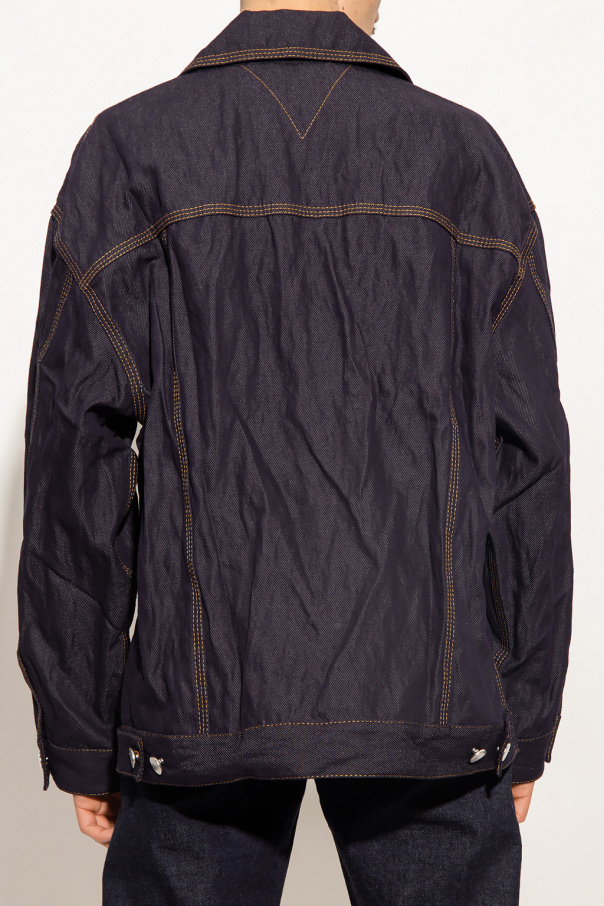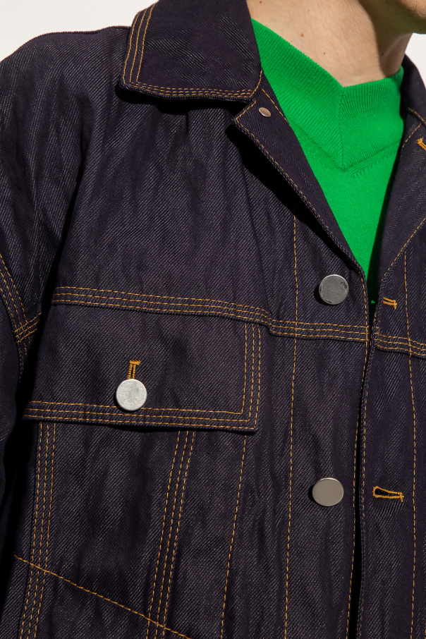 Navy blue denim jacket from Bottega Veneta. Crafted from metallic twlil, this style showcases contrasting yellow stitching details, button fastenings, two flapped button pockets and long sleeves with button cuffs.
