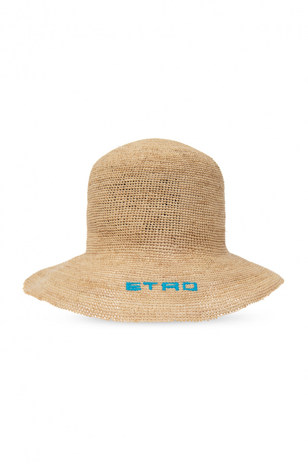 Beige bucket hat from Etro. Crafted from natural raffia, this item features the brand's ‘Pegaso’ motif and blue logo embroidery on the brim.