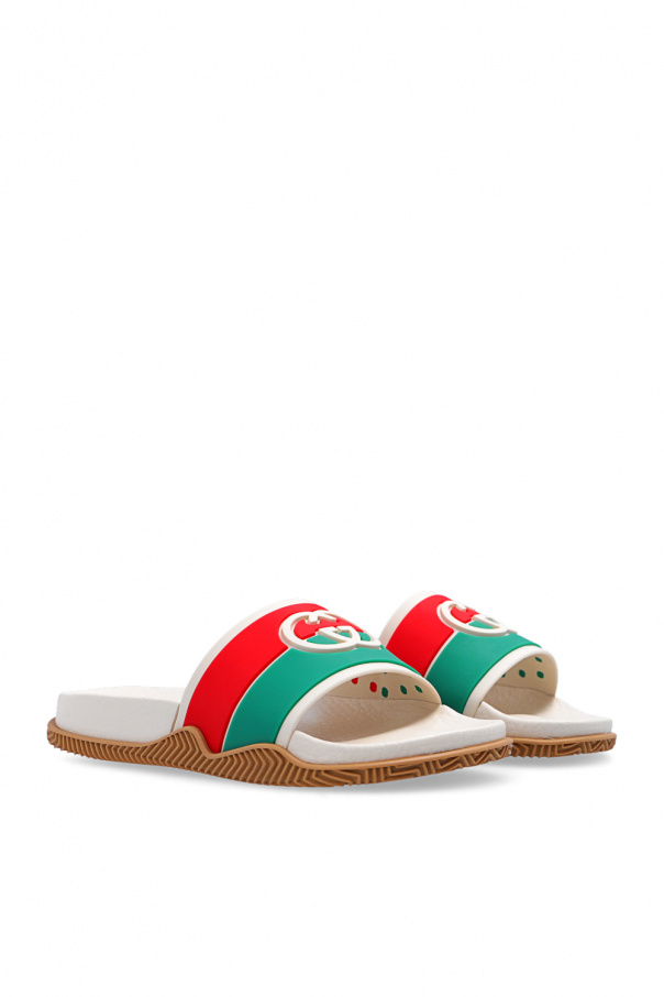 Cream slides from Gucci Kids. Resting on a brown and cream rubber sole, this pair features a red and green Web stripe and a raised logo.