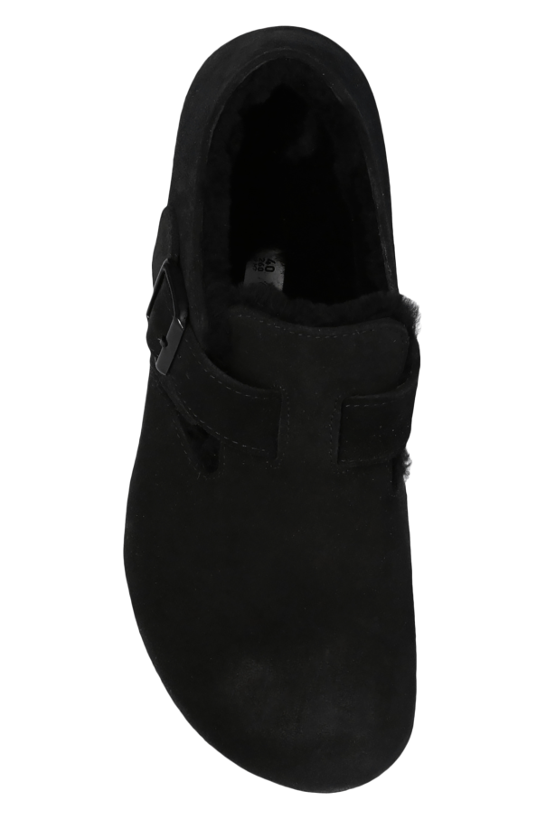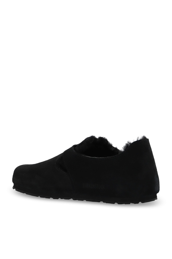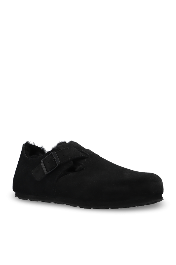 Black ‘London Shearling’ shoes from Birkenstock. Made from suede, this model features a slip-on silhouette with an adjustable buckle strap and an embossed logo on the side, a soft sheep fur lining, an anatomically shaped cork-latex footbed and an EVA foam outsole. Narrow width.