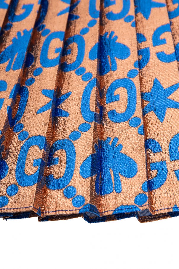 Gold-tone pleated two-layered skirt from Gucci. Elastic waistband trimmed with a colorful pattern embroidered with a lurex thread. Decorated with a logo pattern.