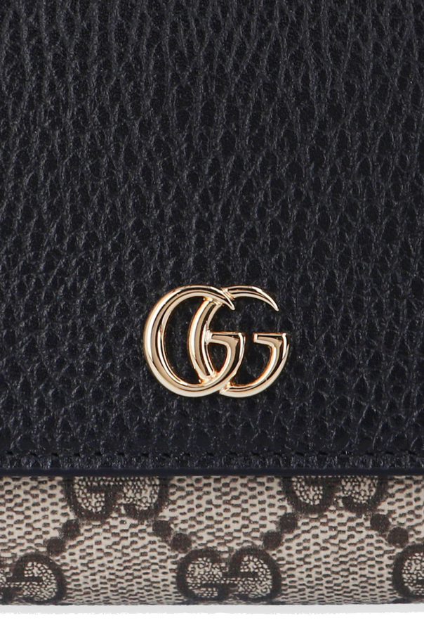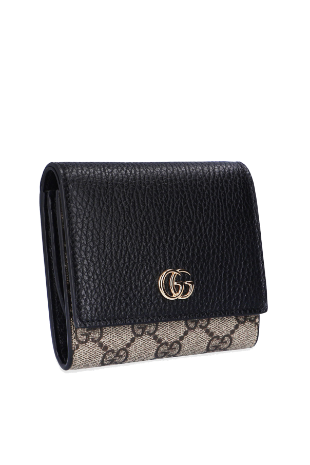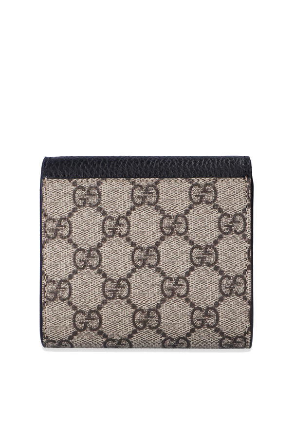 Beige and black wallet from Gucci. Crafted from textured leather and finished with ‘GG Supreme’ canvas, this item fastens via a snap-button and showcases a gold-tone logo plaque as well as six card slots, one zipped coins pocket and a bills compartment inside.