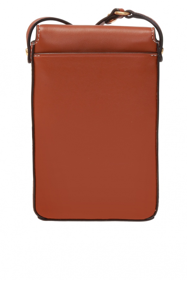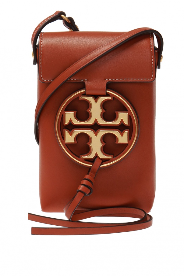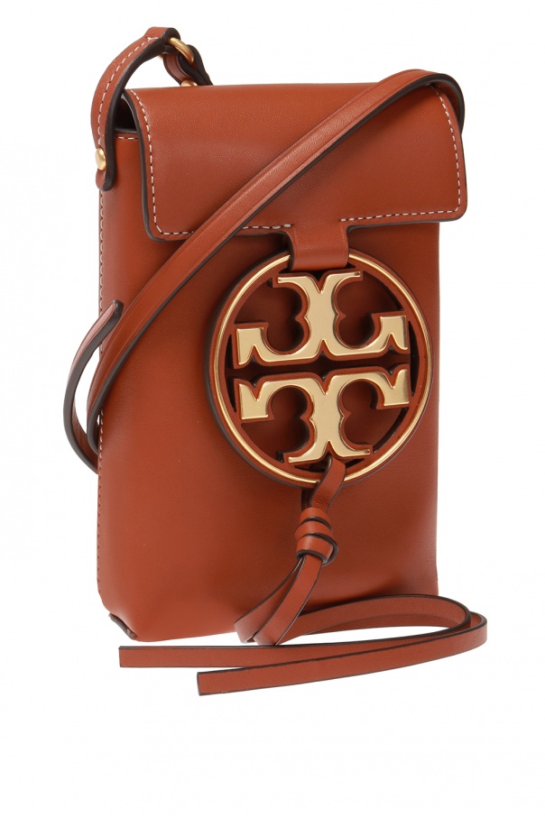 Brown ‘Miller’ phone case from Tory Burch. Made of leather. Magnetic snap fastening. Decorated with a gold-tone metal logo and white stitching details. Adjustable shoulder strap. Main internal compartment with two card slots.