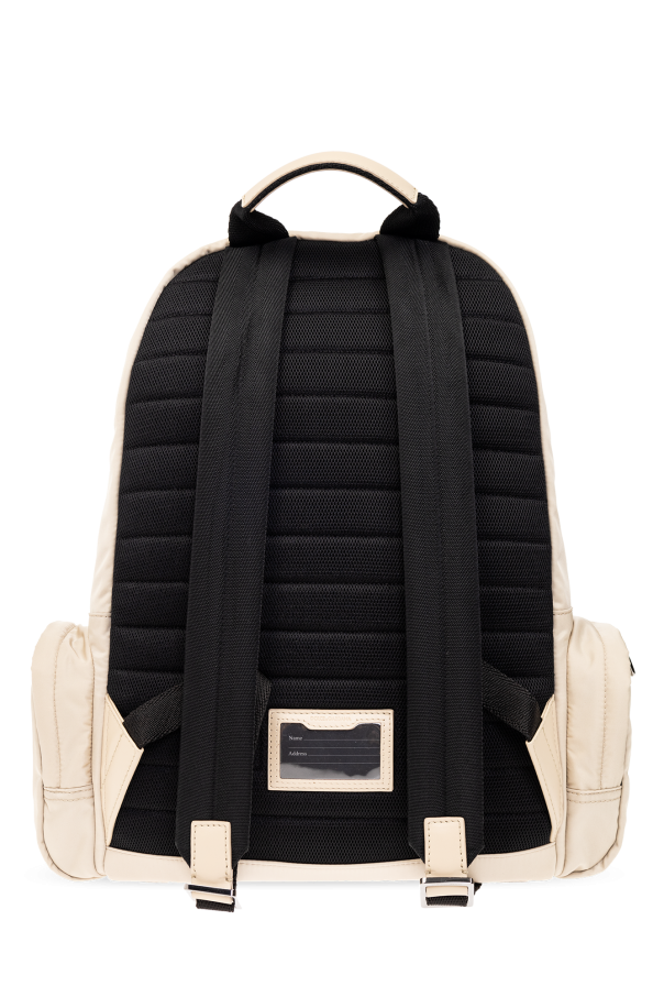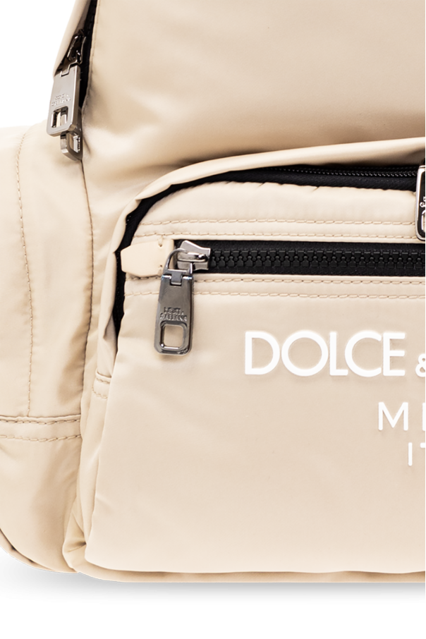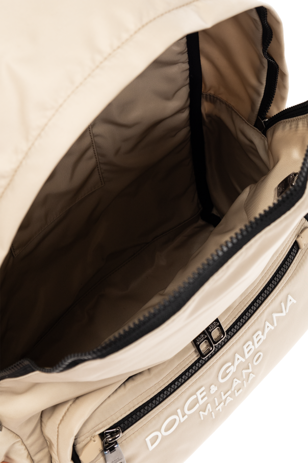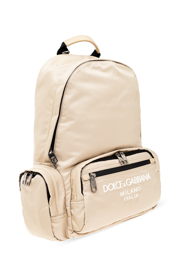 Beige backpack from Dolce & Gabbana. Embellished with a rubberised logo, this design secures with a two-way zip and features a half-round handle, front and side pockets with two-way zips, adjustable shoulder straps, silver-tone metal hardware and one internal compartment with two slip pockets and one zip pocket.