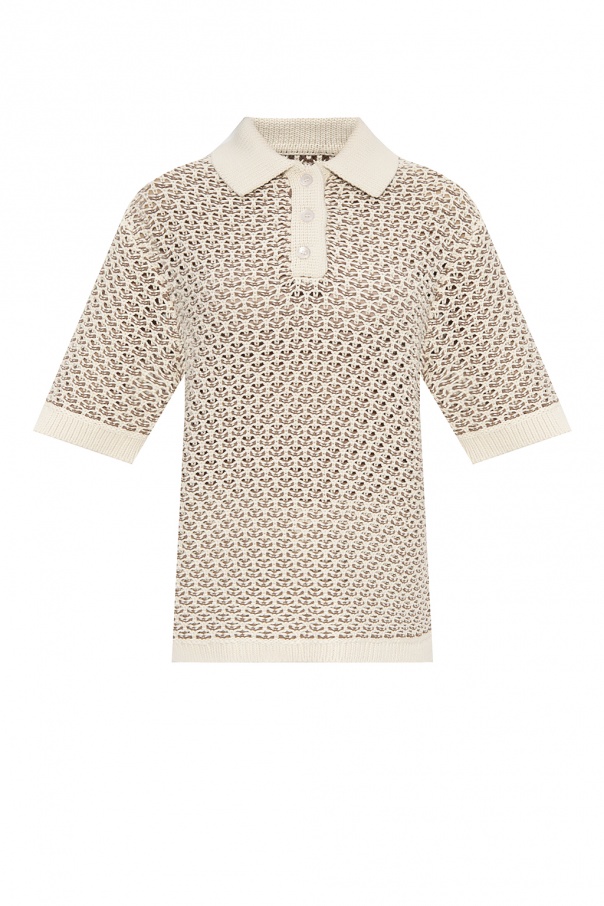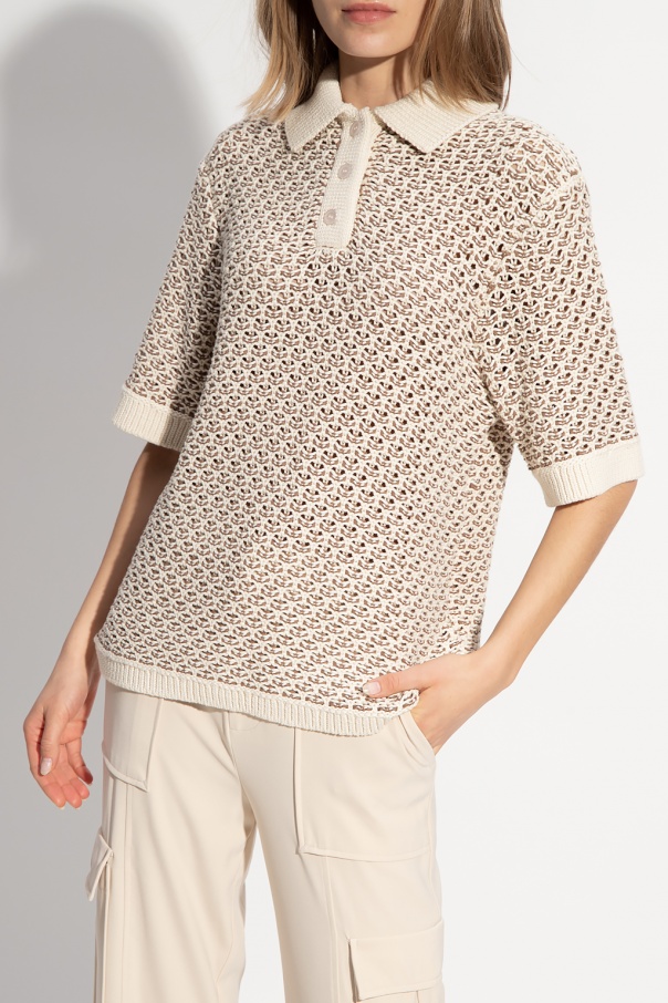 Cream and white knitted polo shirt from Samsoe Samsoe. Fastened with buttons, this garment features ribbed trims at the hem and cuffs.