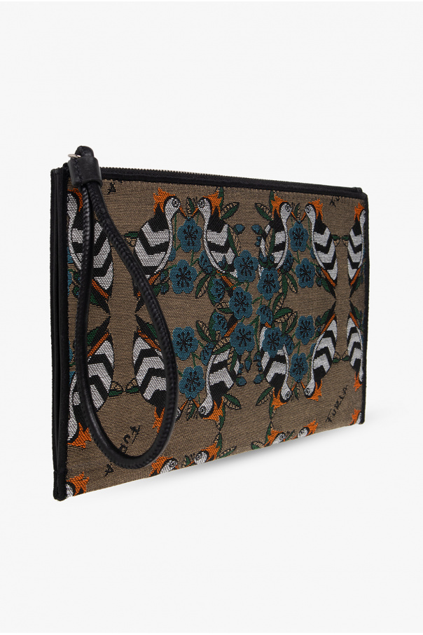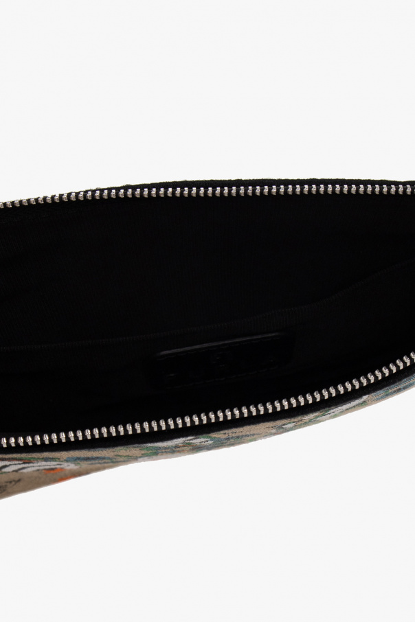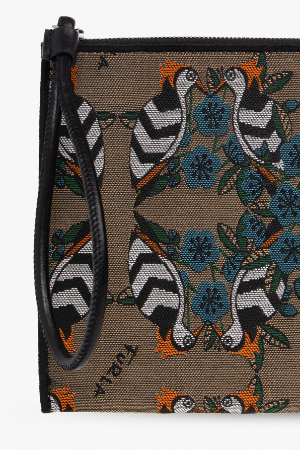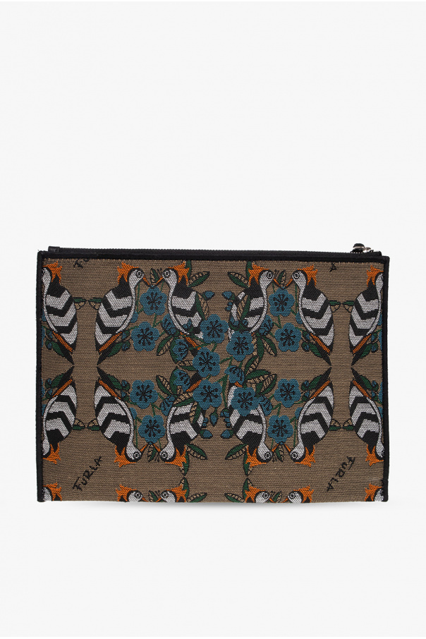 Beige and black ‘Opportunity’ handbag from Furla. Crafted from canvas embroidered with a colourful graphic pattern, this design features a zip fastening with a wrist strap, silver-tone metal hardware and one internal compartment with a slip pocket.