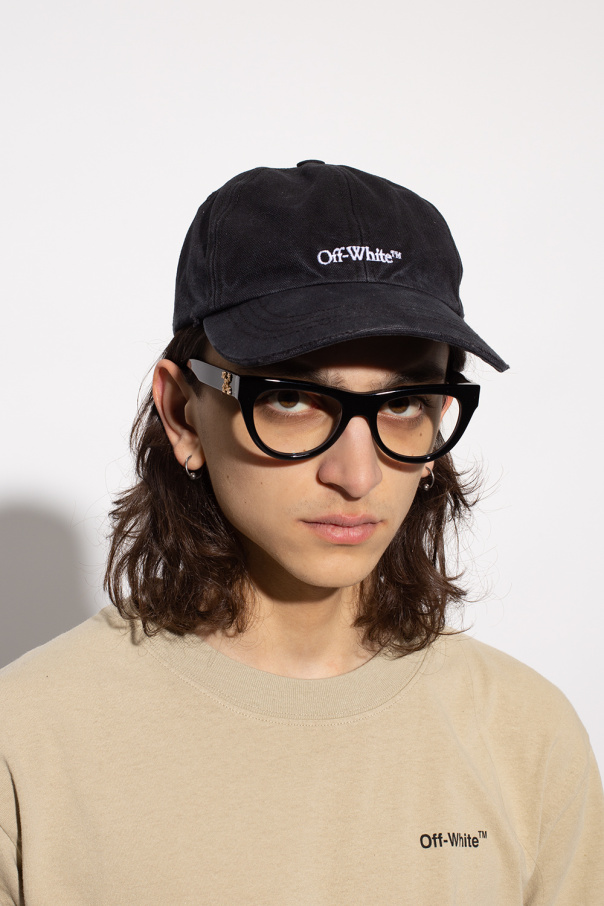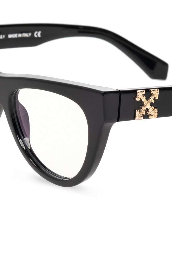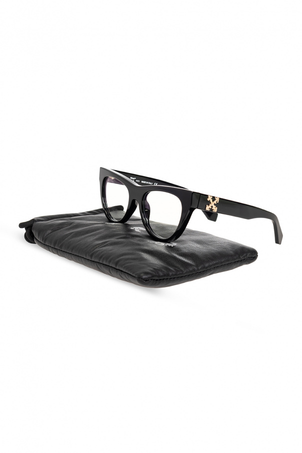 Black ‘Style 4’ optical glasses from Off-White. With a cat-eye design, this pair features gold-tone tactile branding on the temples and transparent lenses which block the blue light. Case included.