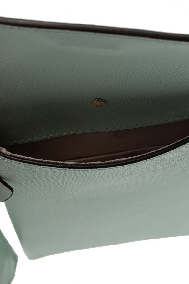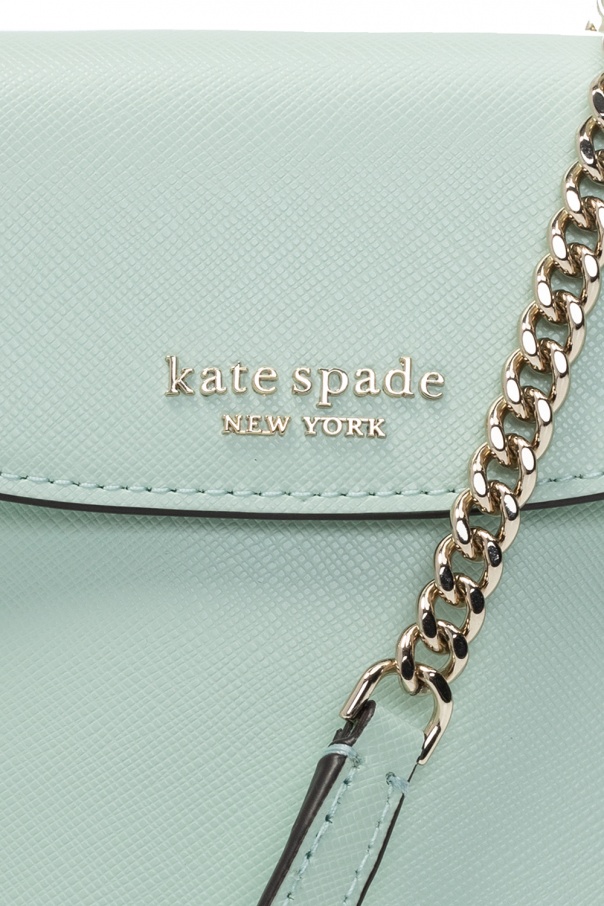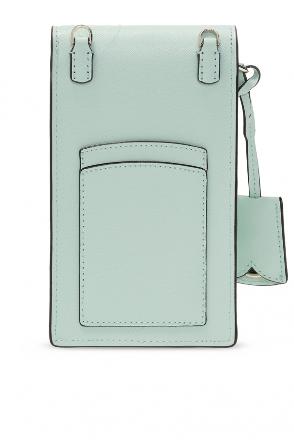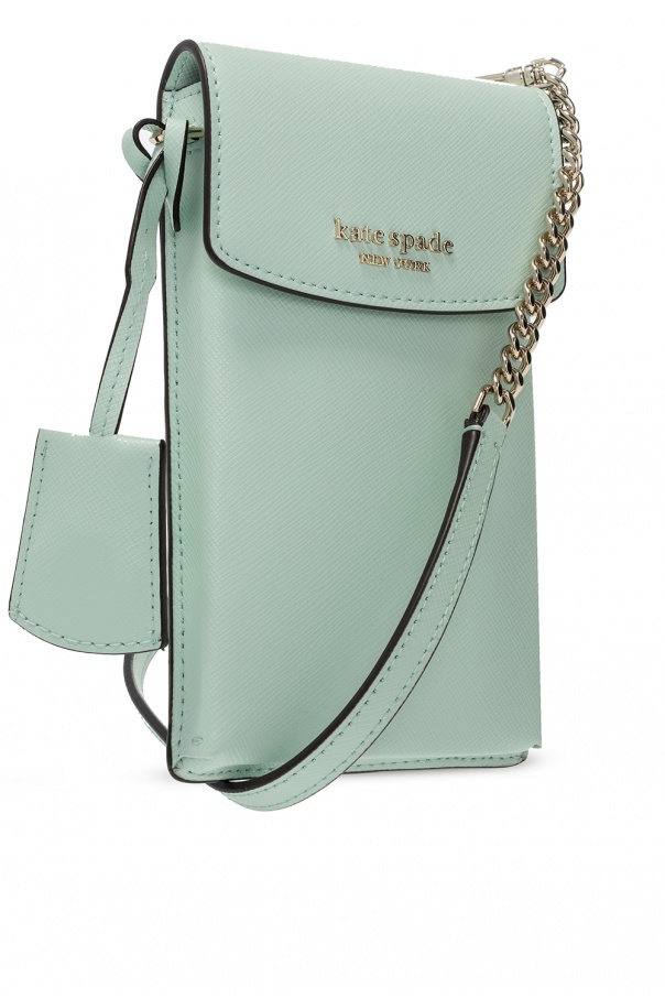 Green ‘Spencer’ card holder from Kate Spade. Crafted from leather, this design fastens with a magnetic snap and is decorated with a metal logo in gold-tone. It is complete with three card slots at the back, a charm as well as a detachable and adjustable shoulder strap.