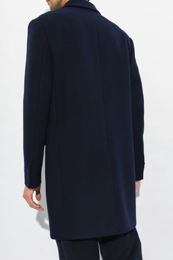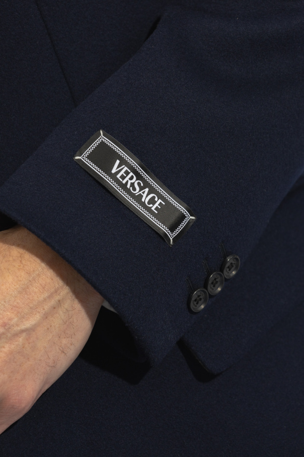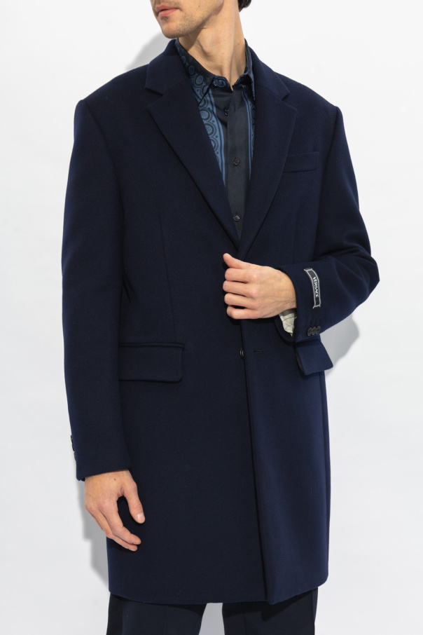 Navy blue coat from Versace. Made of a wool and cashmere blend, this style features a single back vent, button fastenings, notch lapels, long sleeves as well as one welt pocket and two flapped pockets.