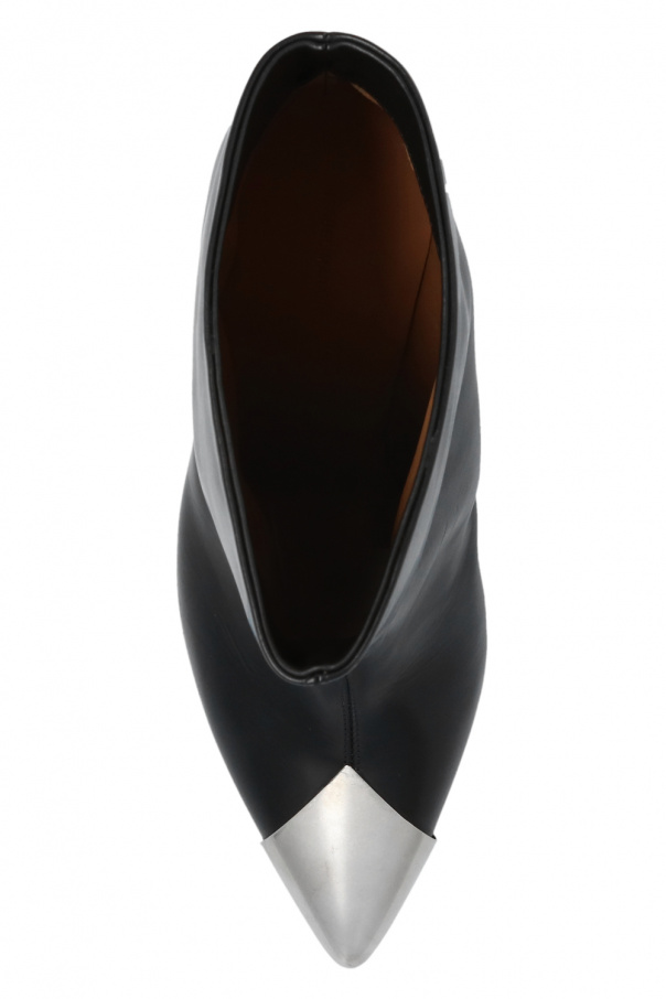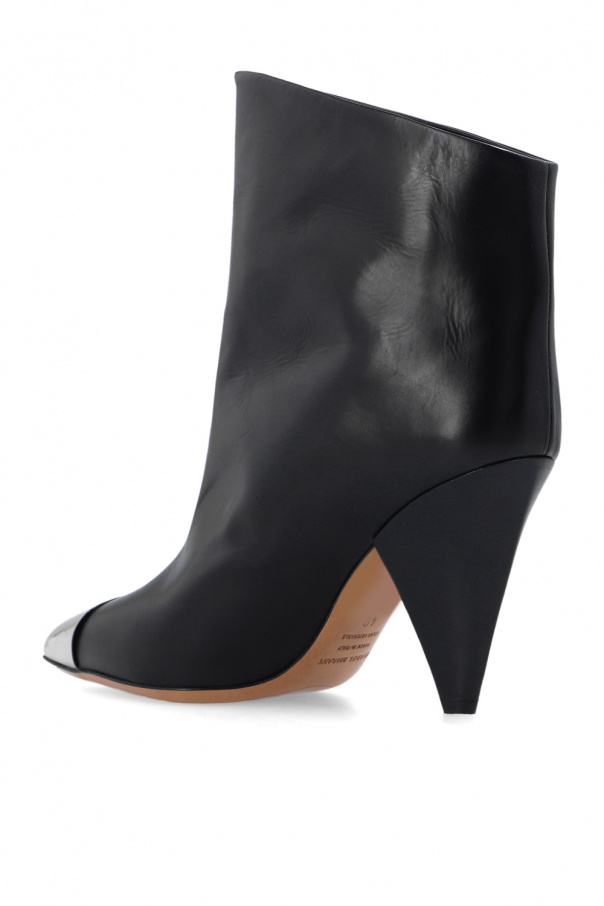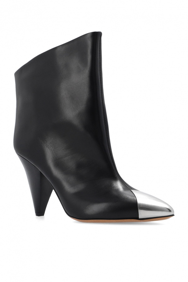 Black ‘Lapio’ heeled ankle boots from Isabel Marant. Made of calf leather, this pair features a beige leather sole and pointed toe with a silver-tone appliqué.