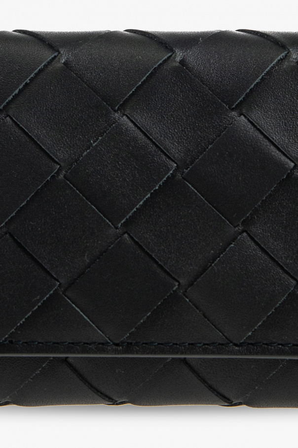Dark green key holder from Bottega Veneta. Crafted from calf leather with the brand's iconic Intrecciato weave, this design secures with snaps and features a blue-clad interior with one slip pocket and six key hooks inside.