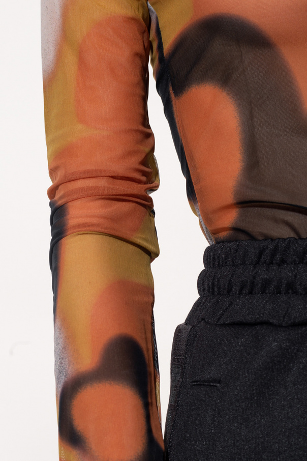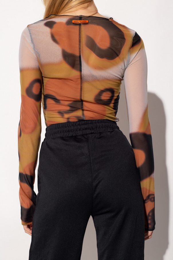 Yellow, orange and black top from Heron Preston. Crafted in sheer fabric, this style features long sleeves and a distinctive graphic pattern.