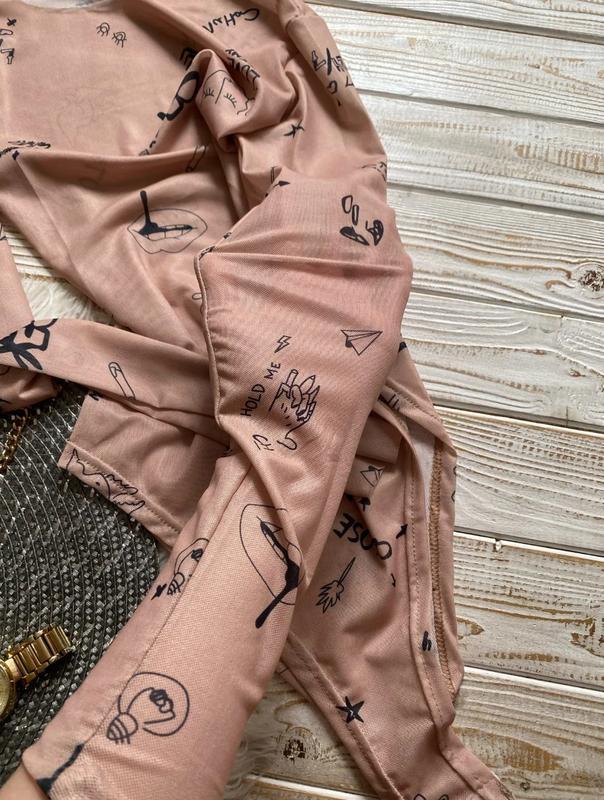 Сетчатый боди комбидресс тату с круглым вырезом декольте и длинными рукавами. Снизу на застежках-кнопках. Горловина и рукава отрезные. В наличии размеры S, M, L. Немного маломерят. Ткань хорошо тянется. Положение рисунка произвольное, может быть перевернутым.