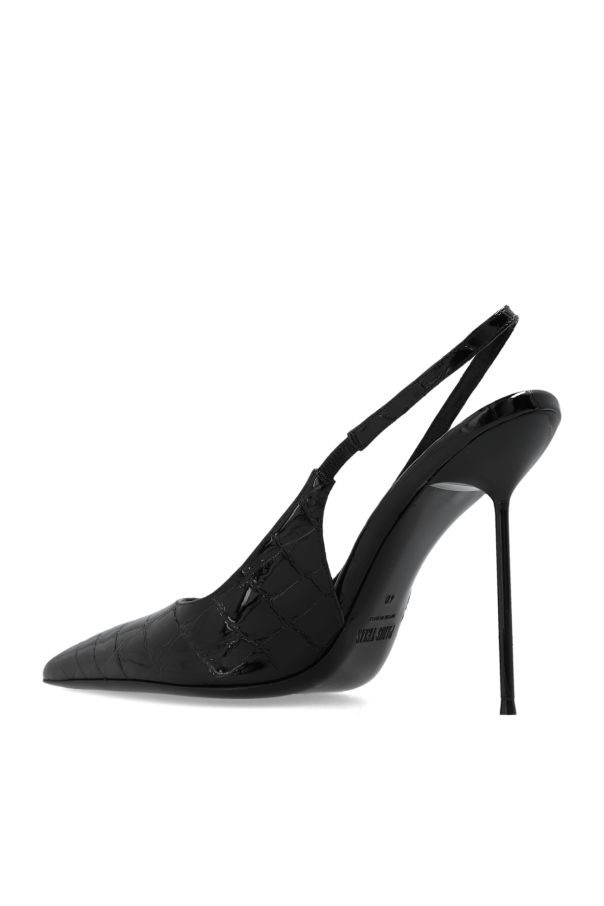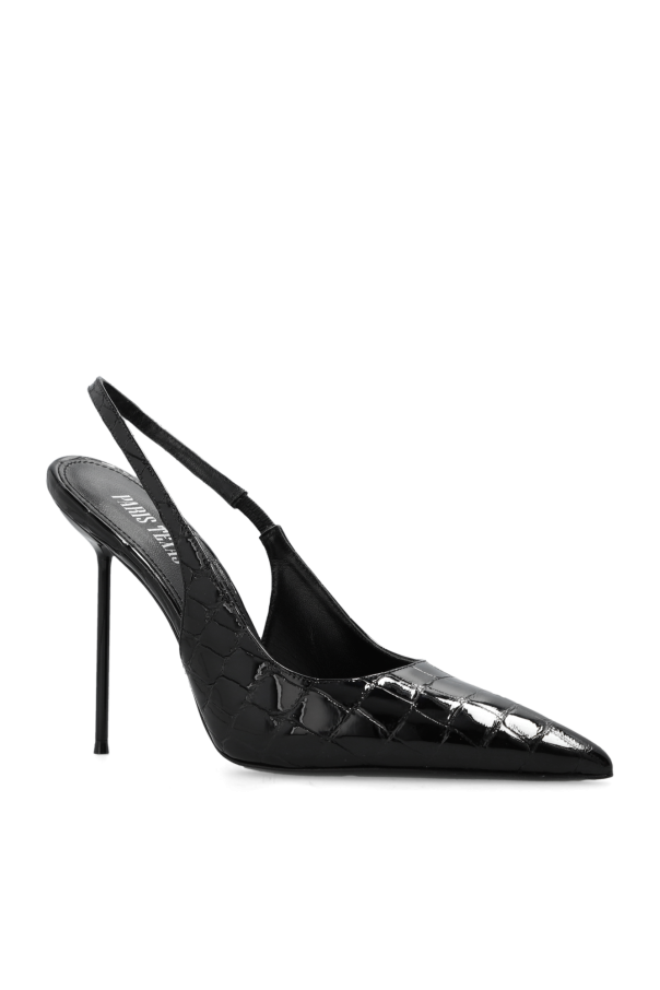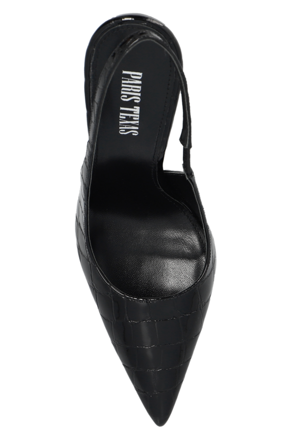Black ‘Lidia’ pumps from Paris Texas. Made of calf leather with a crocodile skin effect, this pair features an elastic heel strap, pointed toe and black leather sole.