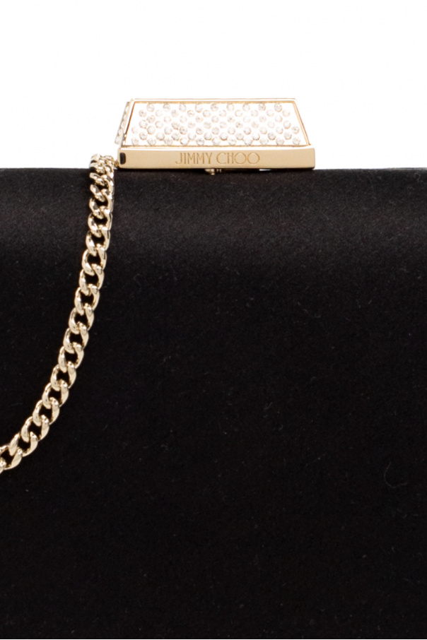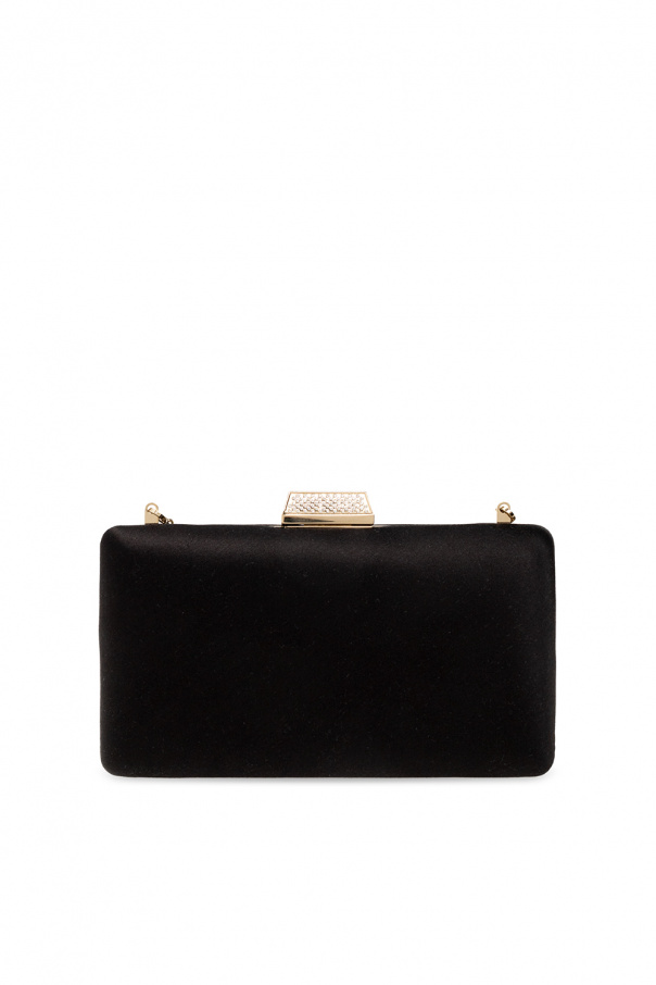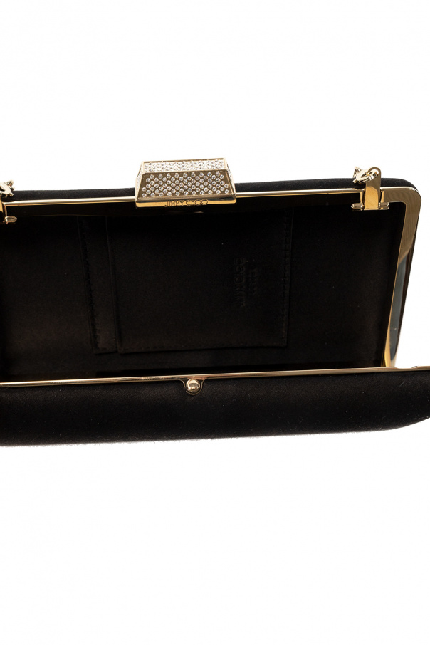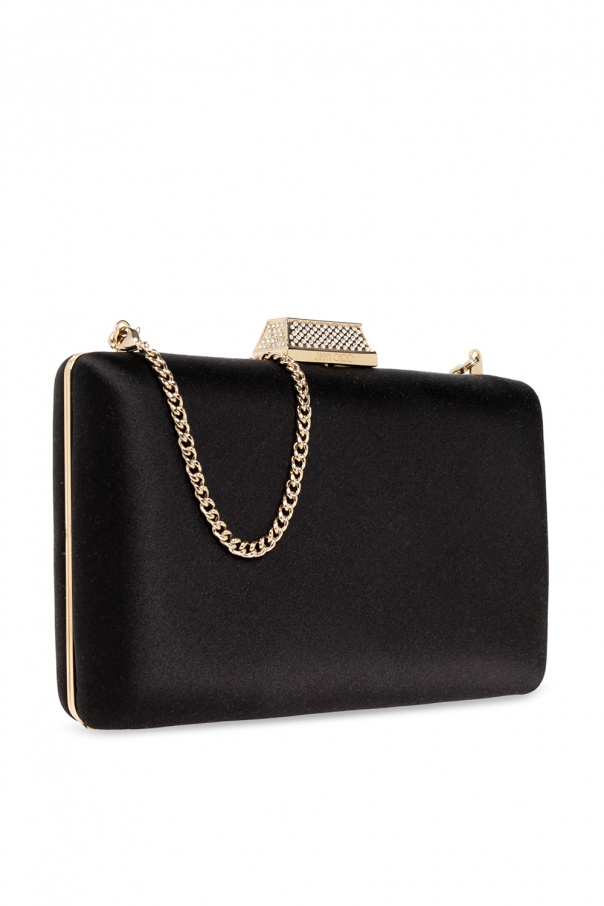 Black ‘Clemmie’ satin clutch from Jimmy Choo. Fastened with crystal-embellished snaps, this style is complete with an engraved logo, a detachable chain, gold-tone metal hardware as well as a phone pocket and card slot inside.