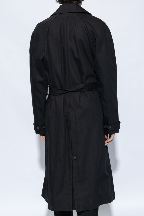 Black ‘Lou’ double-breasted coat from A.P.C. Crafted from a blend of cotton and wool, this design features button fastening, collar, waist belt, two slip pockets, single rear vent and long sleeves with buttoned cuffs.