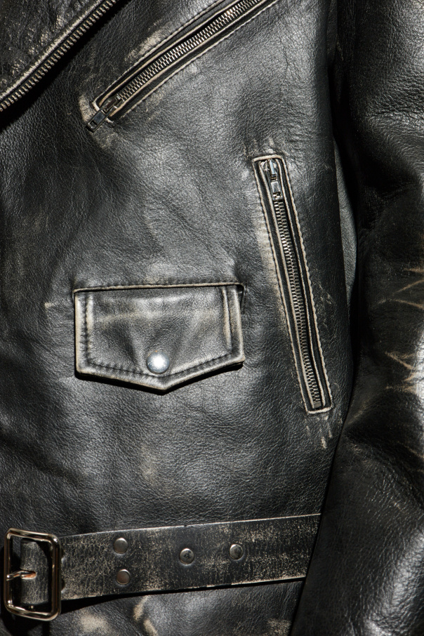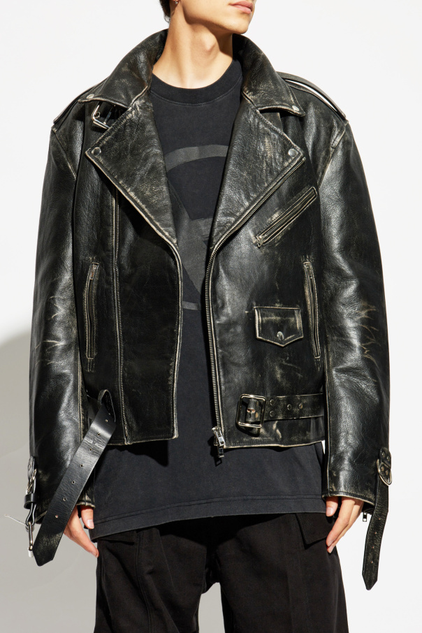 Introducing the Leather Biker Jacket by the illustrious fashion brand VETEMENTS. This jacket is meticulously crafted from premium, thick leather, exuding an air of durability and sophistication. Its rich black hue, enhanced by subtle distressed accents, conjures a timeless vintage allure. The jacket boasts a classic biker silhouette featuring a broad collar and an asymmetrical zip closure. Exquisitely designed, it includes multiple external pockets: two side zip pockets, a chest pocket with a zipper, and a flap pocket secured with a snap. The adjustable belt with a metal buckle at the hem ensures a tailored fit, while the buckle straps on the sleeves provide additional customization for your comfort. Further accentuating its uniqueness, the jacket's back showcases a decorative buckle strap. The subtle distressing throughout adds character, delivering an authentic vintage appearance. The inner label bearing the designer's logo certifies the exclusivity and authenticity of this magnificent piece. Why Choose This Product? High-quality, durable leather construction Timeless vintage aesthetic Versatile and adjustable fit Exclusive design from VETEMENTS Multiple functional pockets