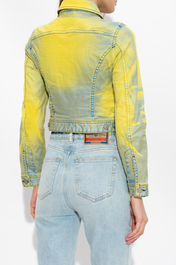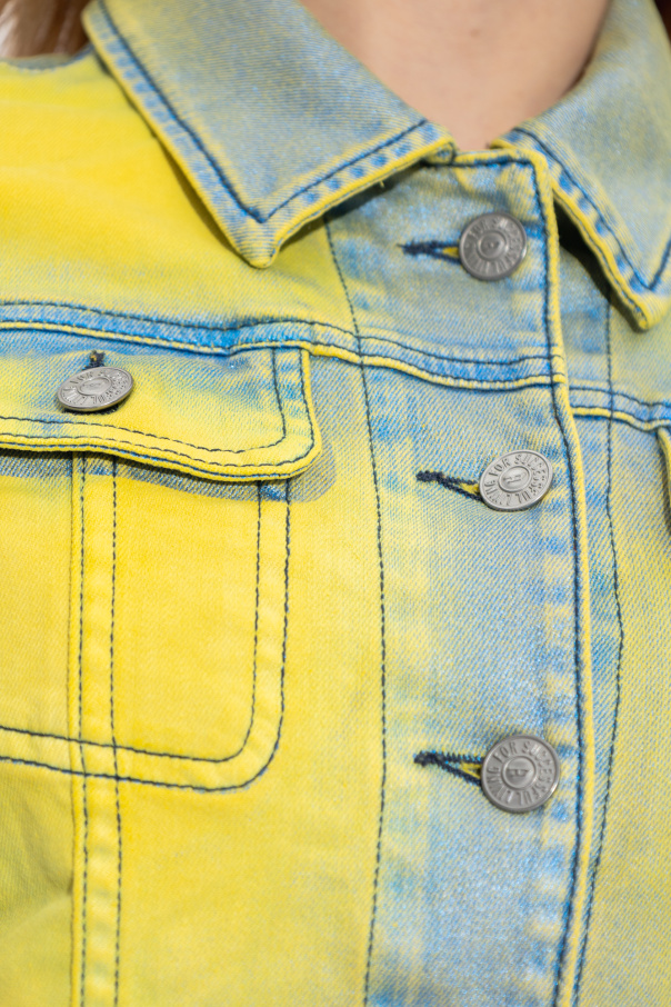 Yellow and blue ‘DE-SLIMMY-S‘ jacket from Diesel. Made of cotton, this garment features button fastenings, a metallic paint effect, logo embroidery, collar, two buttoned flap pockets and long sleeves with buttoned cuffs.