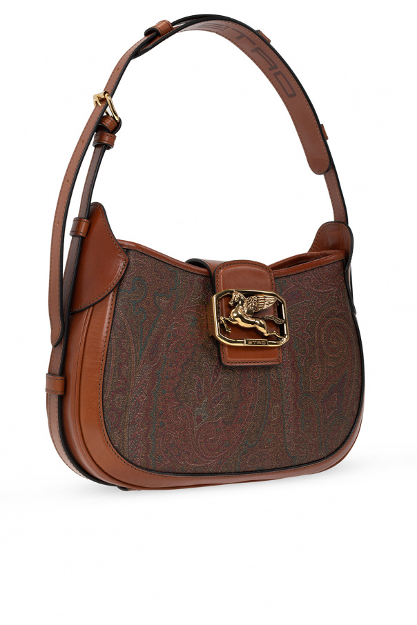 Brown shoulder bag from Etro. Crafted from canvas printed with the brand’s signature paisley motif, this style is complete with leather trims, decorative closure, logo appliqué, back pocket, adjustable strap, gold-tone metal hardware and one internal compartment with one zip pocket.