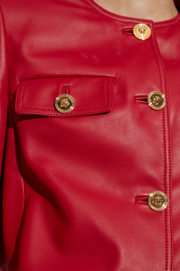 Introducing the epitome of sophistication: a red leather jacket by the illustrious designer Versace. This masterpiece melds timeless elegance with modern flair, epitomizing the brand's rich heritage and avant-garde sensibilities. Crafted from the finest lamb leather, this jacket boasts a striking red hue that commands attention. It features a classic, waist-length cut, exuding a refined simplicity that complements its luxurious material. The front closure is adorned with four golden buttons, each intricately embellished with the iconic Medusa motif, a hallmark of Versace's opulent aesthetic. The jacket is designed with two chest pockets, also secured with golden buttons, offering both practicality and style. Its long sleeves are finished with golden buttoned cuffs, adding a touch of regal elegance to this contemporary piece. The neckline is a round, collarless design, enhancing its sleek, modern silhouette. Why choose this product? Crafted from premium lamb leather for superior quality and durability. Exclusive Versace design with iconic Medusa-embossed golden buttons. Elegant, timeless cut that complements any sophisticated wardrobe. Functional chest pockets for added convenience. Unparalleled craftsmanship, merging Italian tradition with contemporary innovation.
