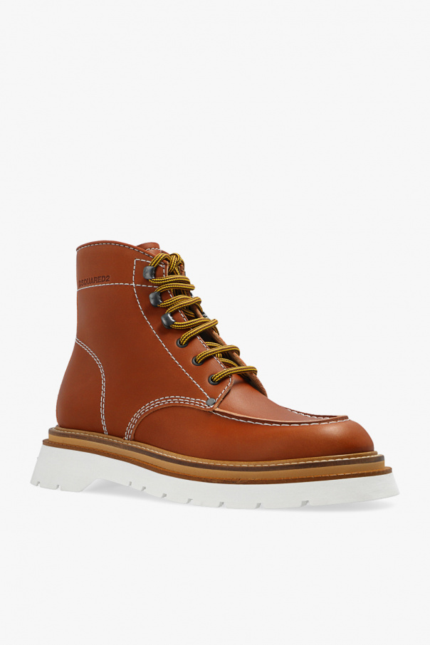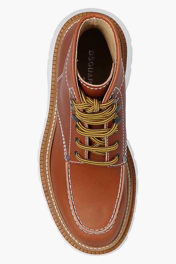 Brown ‘Joe’ shoes from Dsquared2. Made from leather, this lace-up model sits on a white rubber sole and features an embossed logo and distinctive cream stitching details.