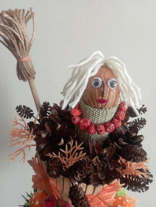 осенняя композиция "Бапа Яга в ступе", осенняя поработка в садик или школу, ручной работы. Высота 23 см.