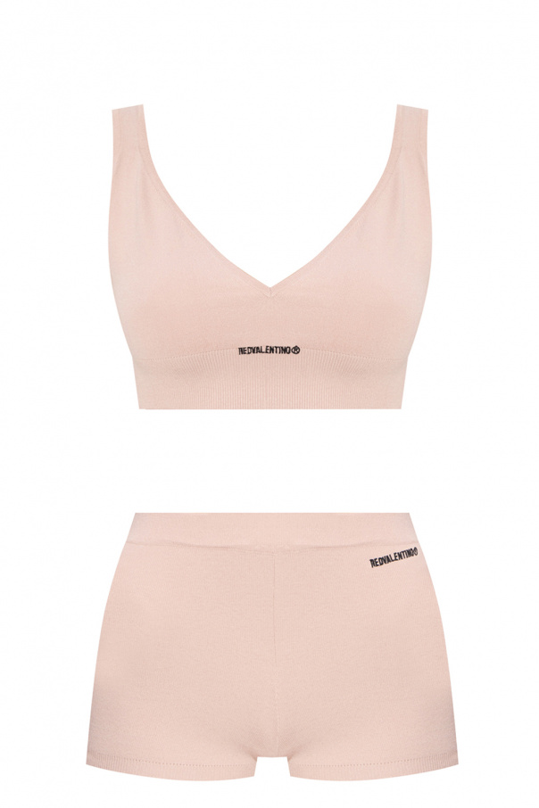 Pink ribbed top and shorts from Red Valentino. Decorated with a black logo embroidery, this set includes a V-neck top, shorts with an elastic waistband and a black dust bag fastened with drawstrings.