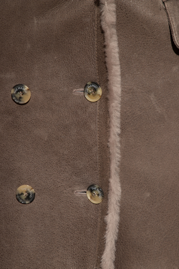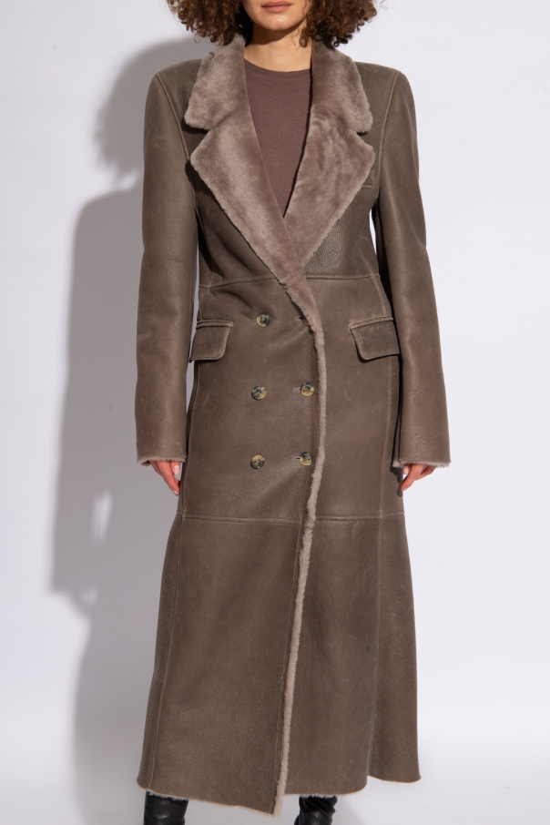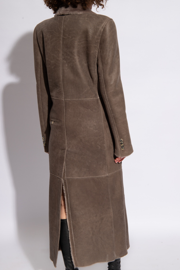 Greyish brown ‘Greenock’ double-breasted coat from The Mannei. Made of leather, this double-breasted design features buttons, notch lapels, two flap pockets, one slip pocket, decorative stitches and long sleeves.