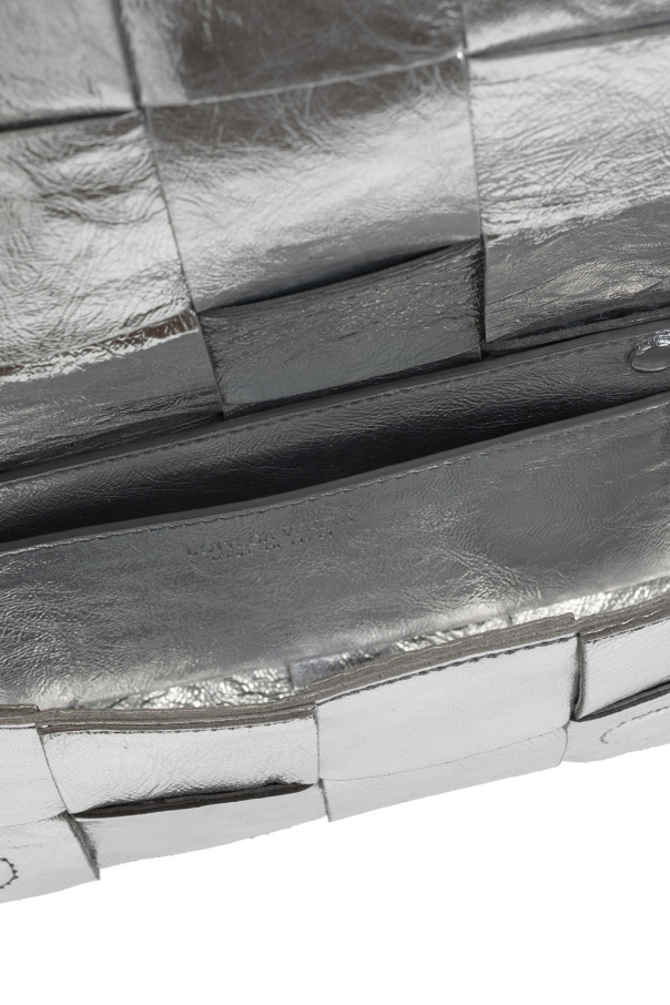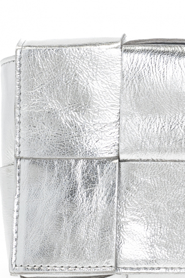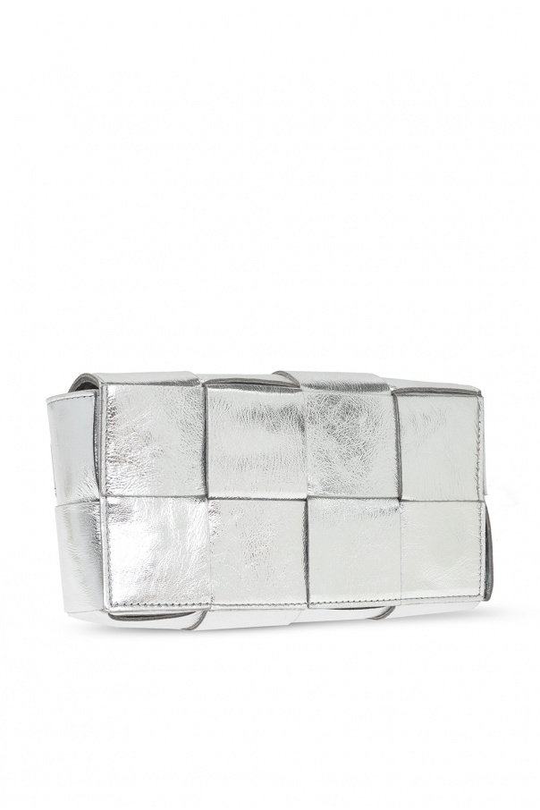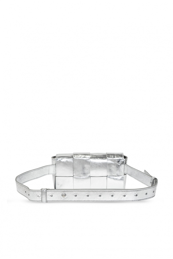 Silver-tone ‘Cassette’ belt bag from Bottega Veneta. Made of leather and enriched by the brand's iconic ‘Intrecciato’ weave, this design features magnetic fasteners, an adjustable strap and one internal compartment with a slip pocket.