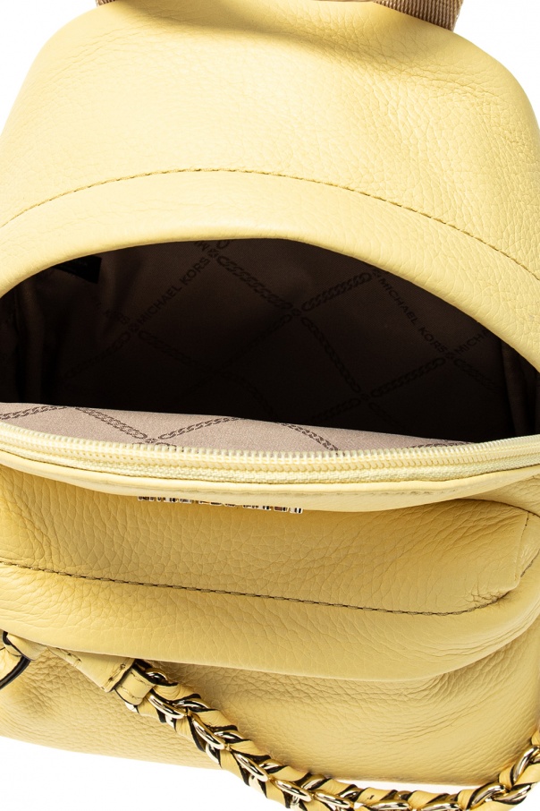 Yellow ‘Slater’ backpack from Michael Kors. Crafted from cow leather with a texture throughout, this style fastens via zipper and employs a gold-tone logo plaque, an external zip pocket accentuated with a chain on the front, an external zip pocket on the back, a half-round top handle and adjustable shoulder straps in beige, and interior with one compartment and one slip pocket.