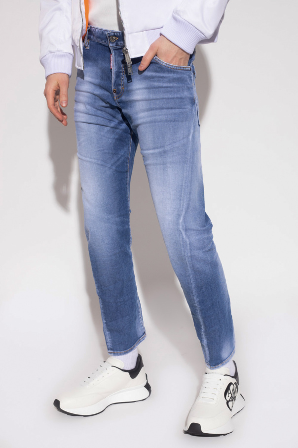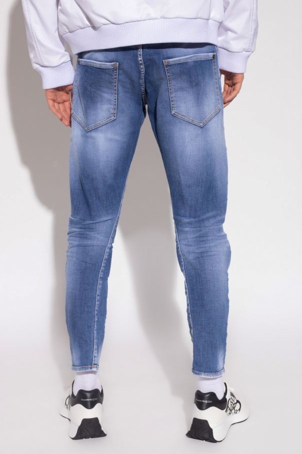 Blue ‘Sexy Twist’ jeans from Dsquared2. Falling with tapered legs, this pair features a dropped crotch silhouette, a hidden button placket with a red and white logo tag, classic five pockets and a cream patch with an embossed logo at the back.
