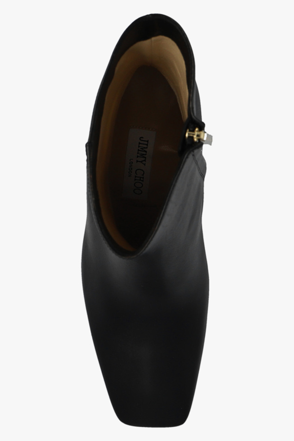 Black ‘Kinsey’ heeled ankle boots from Jimmy Choo. Crafted from leather, this model features a side zipper, a square toe, logo hardware at the back and a beige sole made of leather and rubber at the base.