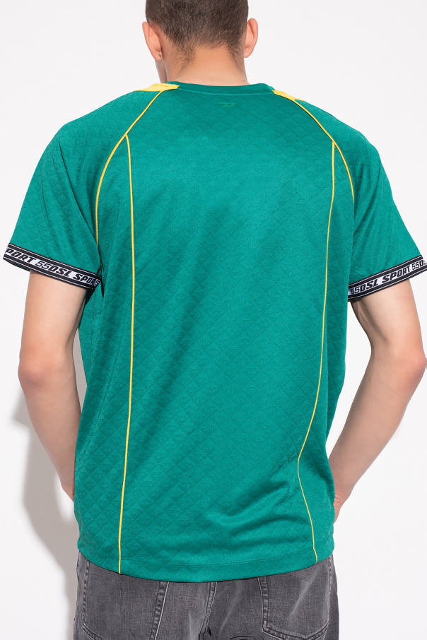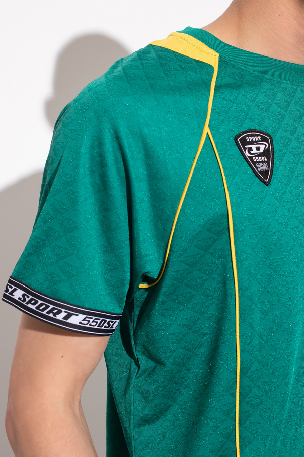 Green ‘AMTEE-OZYNER-WT11’ crewneck T-shirt from Diesel, the ‘DIESEL SPORT’ collection. Embellished with a geometrical pattern, patches and yellow inserts, this style features short sleeves and an elasticated collar.