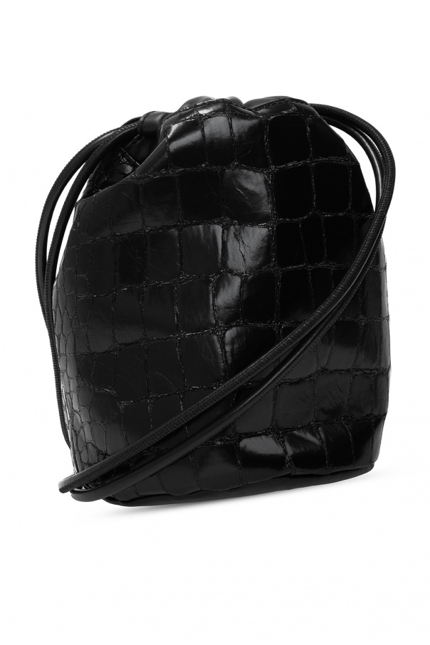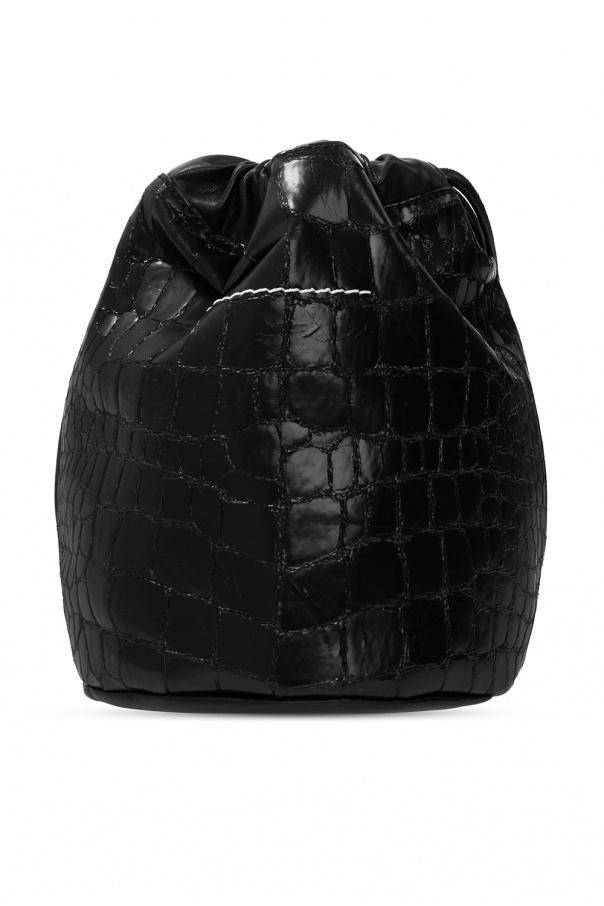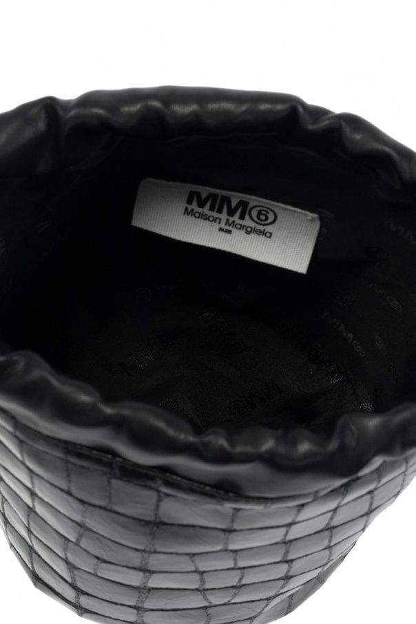 Black bucket bag from MM6 Maison Margiela. Crafted from textured fabric, this design features a black logo print at the bottom, double shoulder strap and one internal compartment.