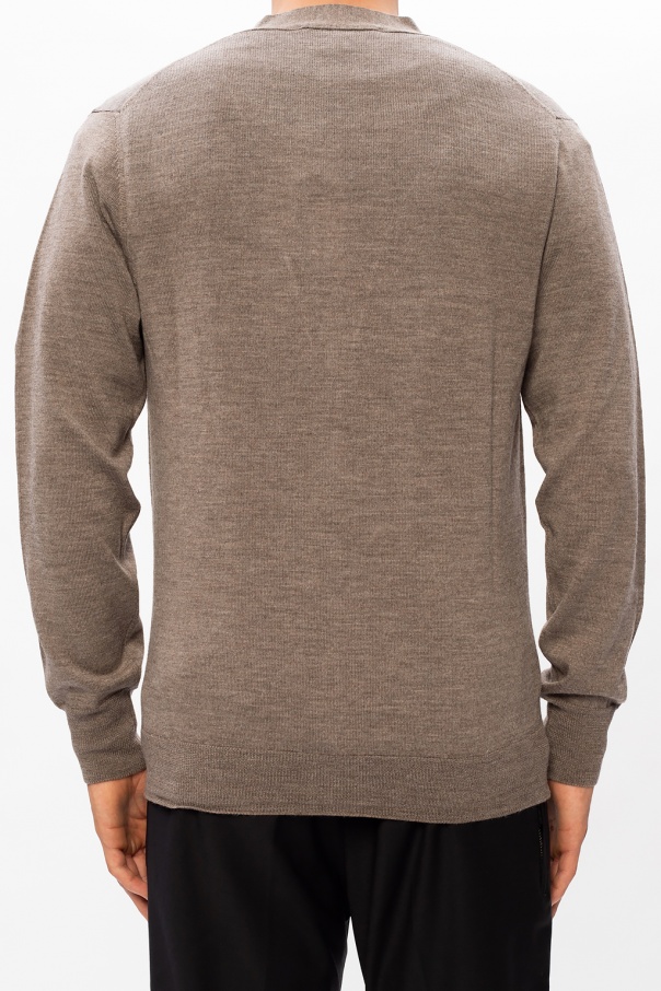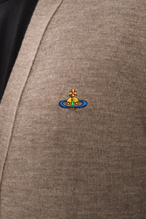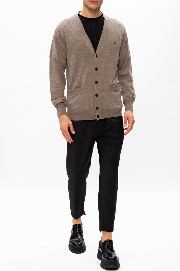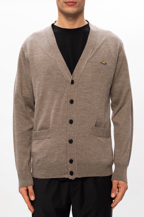 Beige cardigan from Vivienne Westwood. Knitted from wool, this long-sleeved style fastens via buttons and showcases V-neckline, two pockets and the designer's signature colourful logo embroidered on the chest.