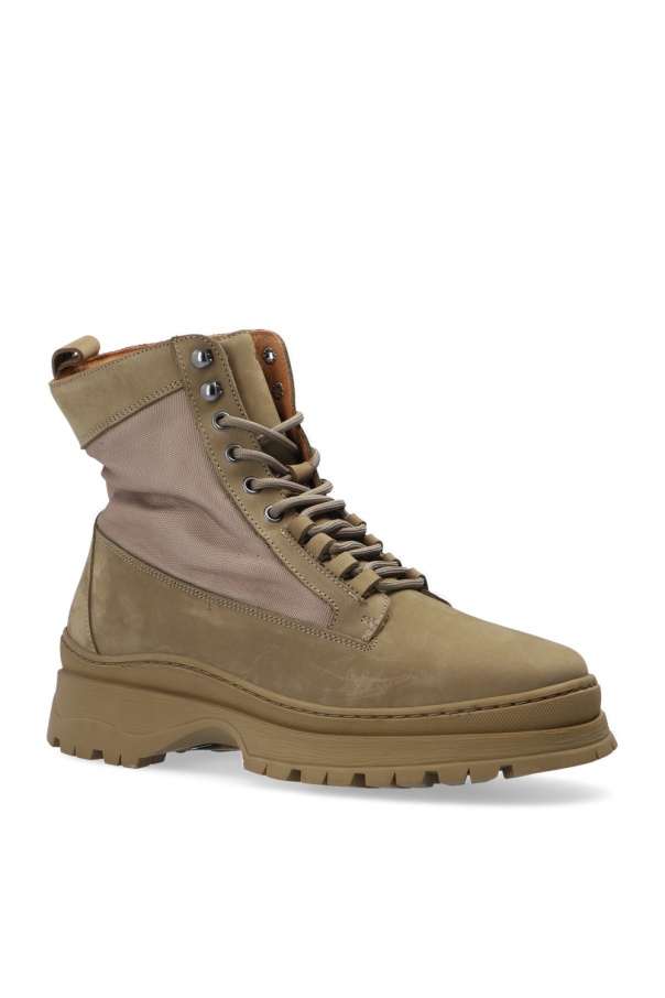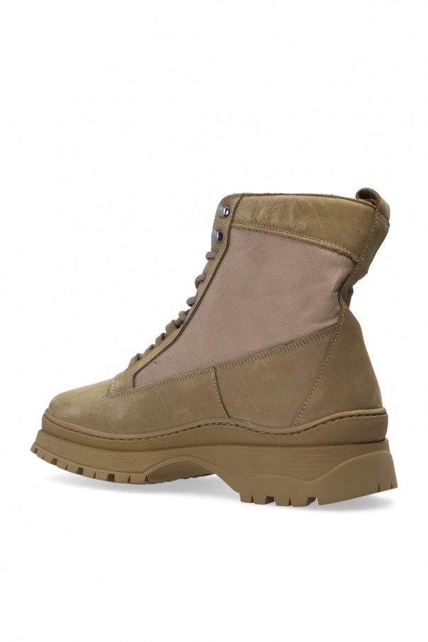 Green ankle boots from Samsoe Samsoe. With a silhouette of a hiking shoe, this lace-up pair was made of suede and is complete with fabric panels, logo embossing on the front and green rubber sole at the base.