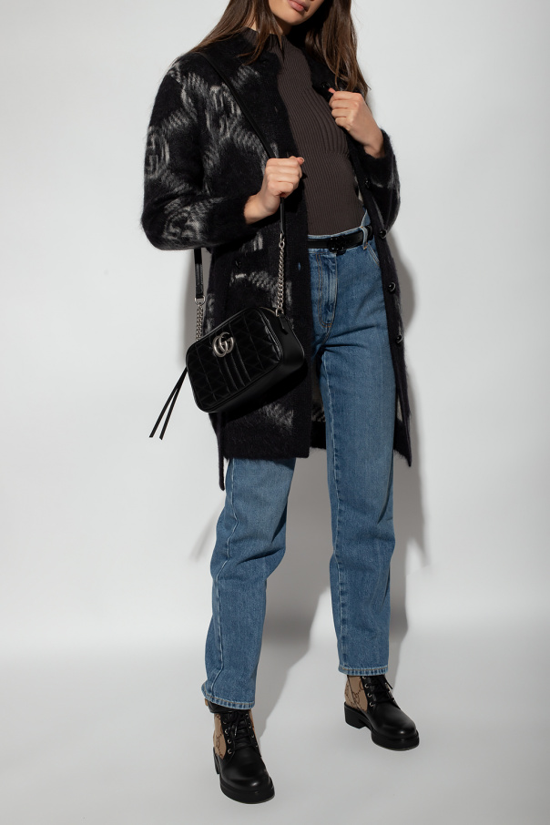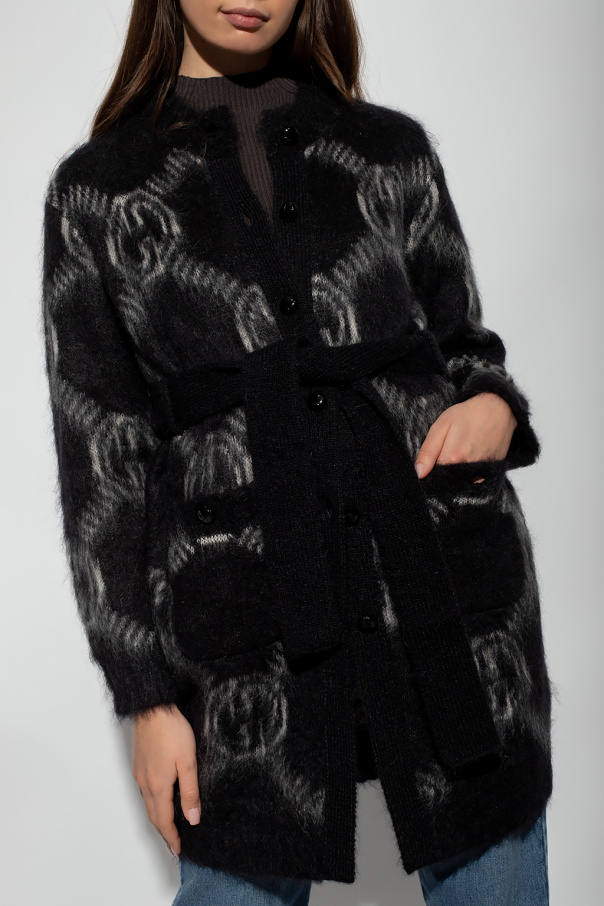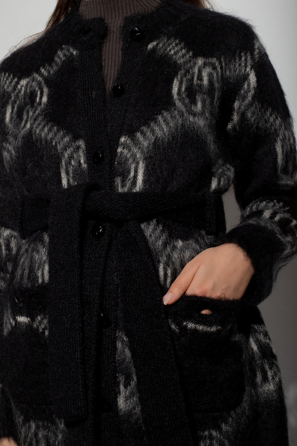 Black and white cardigan from Gucci. Decorated with a logo pattern, this design features button fastenings, two buttoned pockets and ribbed trims at the V-neck, hem and cuffs.