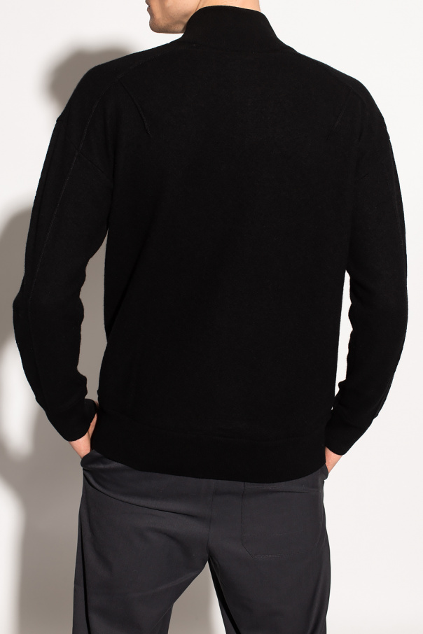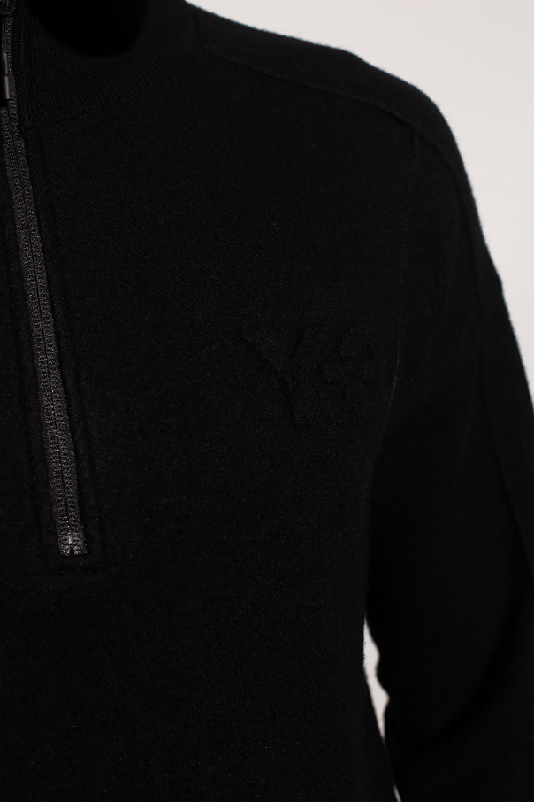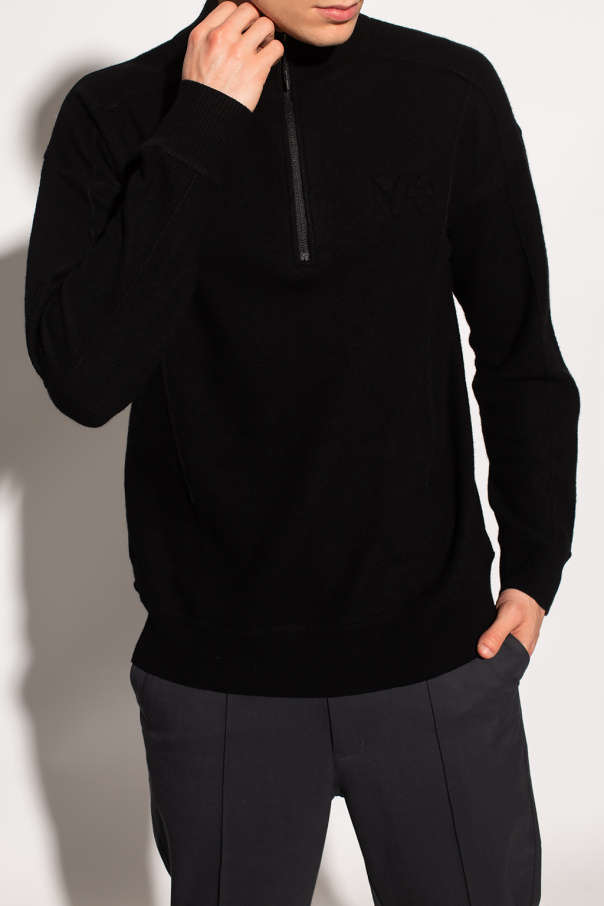 Black sweater from Y-3 Yohji Yamamoto. Made of wool, this item is decorated with a logo pattern, zipped stand-up collar and ribbed trims at the hem and cuffs.