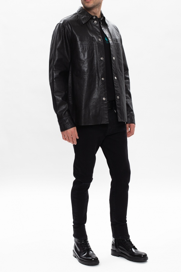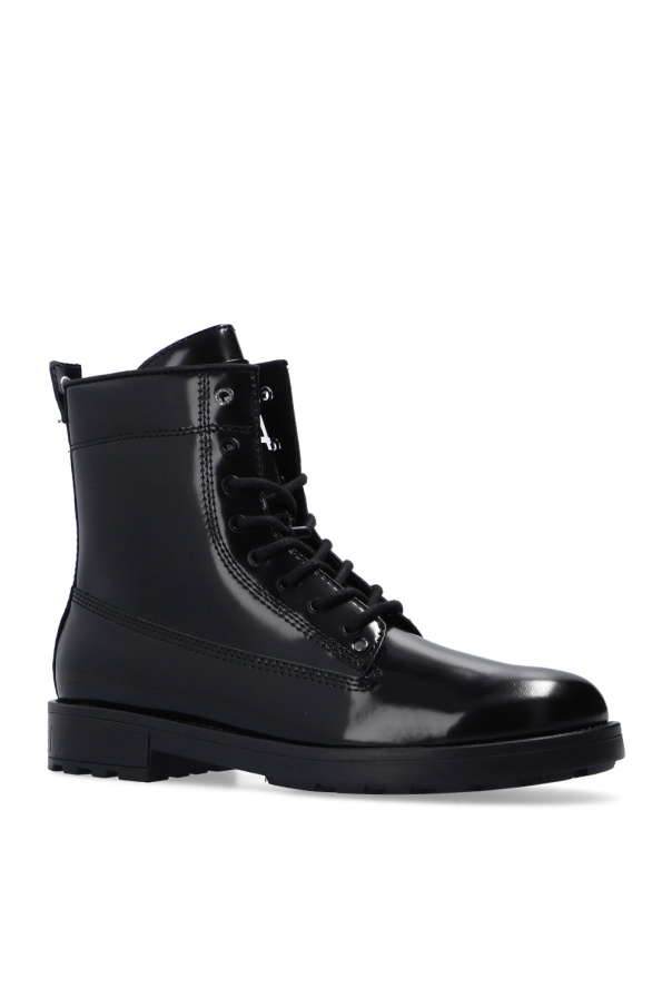 Black ‘D-Throuper’ shoes from Diesel. Crafted from patent cow leather, this lace-up pair sits on a black rubber sole.