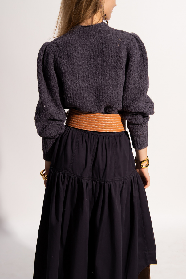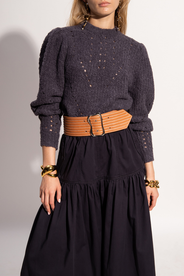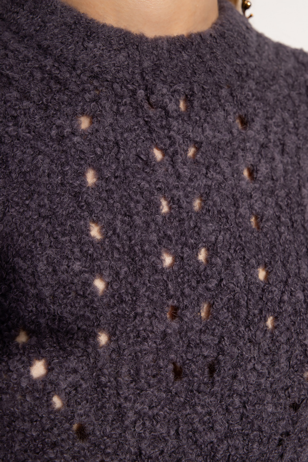 Grey and navy blue 'Jasper' crewneck sweater from Ulla Johnson. Crafted from a wool blend, this style showcases decorative cut-outs and ribbed trims on the collar, bottom hem and cuffs.