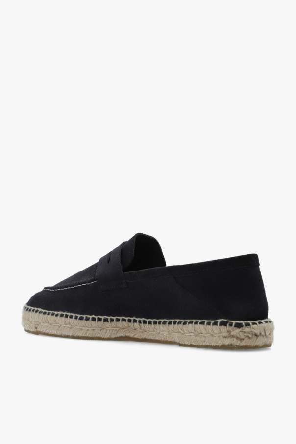 Navy blue ‘Plano’ shoes from Manebi. Made of leather, this model features cut-out detailing and woven jute sole with a beige natural rubber trim at the base.