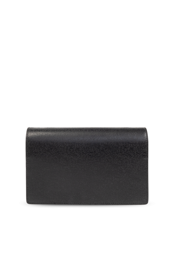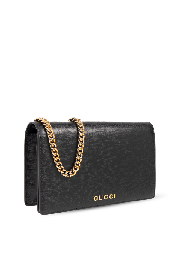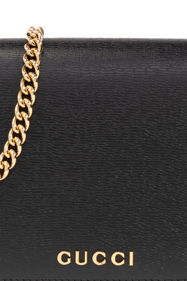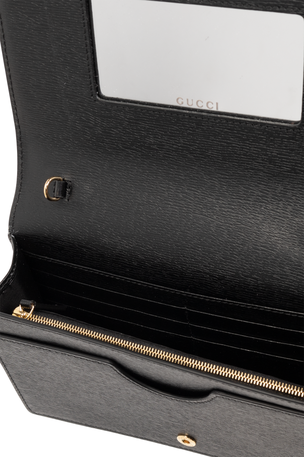Black wallet on a chain from Gucci. Made of calf leather, this design fastens via a snap and showcases a metal logo plaque on the front. It is complete with a detachable chain shoulder strap, gold-tone metal elements and one internal compartment with two slip pockets, one zip pocket and six card slots. The internal side of the flap hides a rectangular mirror.
